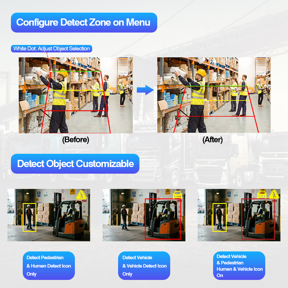 Вградена AI BSD камера за предупредувачко светло за промена на бојата, може да ја промени бојата на светлината кога предметот ќе влезе во соодветната област за откривање (Црвена, Жолта, Зелена).