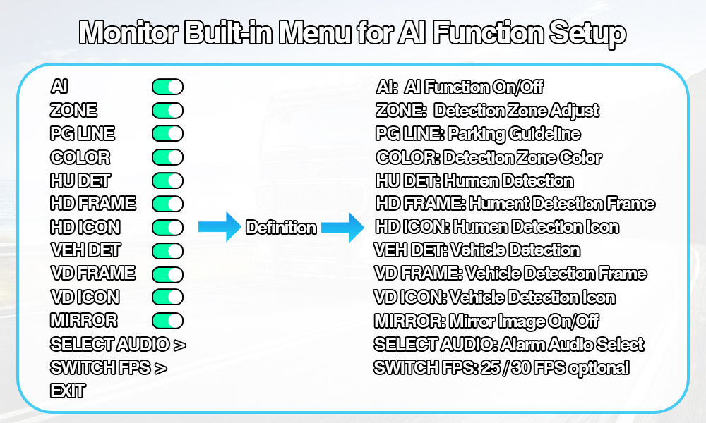 Вештачка интелигенција за откривање слепа точка Вградена камера од заден поглед за предупредување за промена на бојатаВграден систем за камера за откривање слепи точки со вештачка интелигенција Вграден систем за предупредување за промена на боја е интелигентен безбедносен сет на возилото што вклучува AI BSD камера и монитор со вештачка интелигенција, кои поддржуваат поставки за калибрација со вештачка интелигенција, му овозможуваат на корисникот да ја промени поставката за вештачка интелигенција, како што се прилагодување на големината на областа за откривање, избор на тип на аудио аларм, вклучување/исклучување на детекција на пешаци, вклучување/исклучување на откривање на возило и секое друго калибирање.