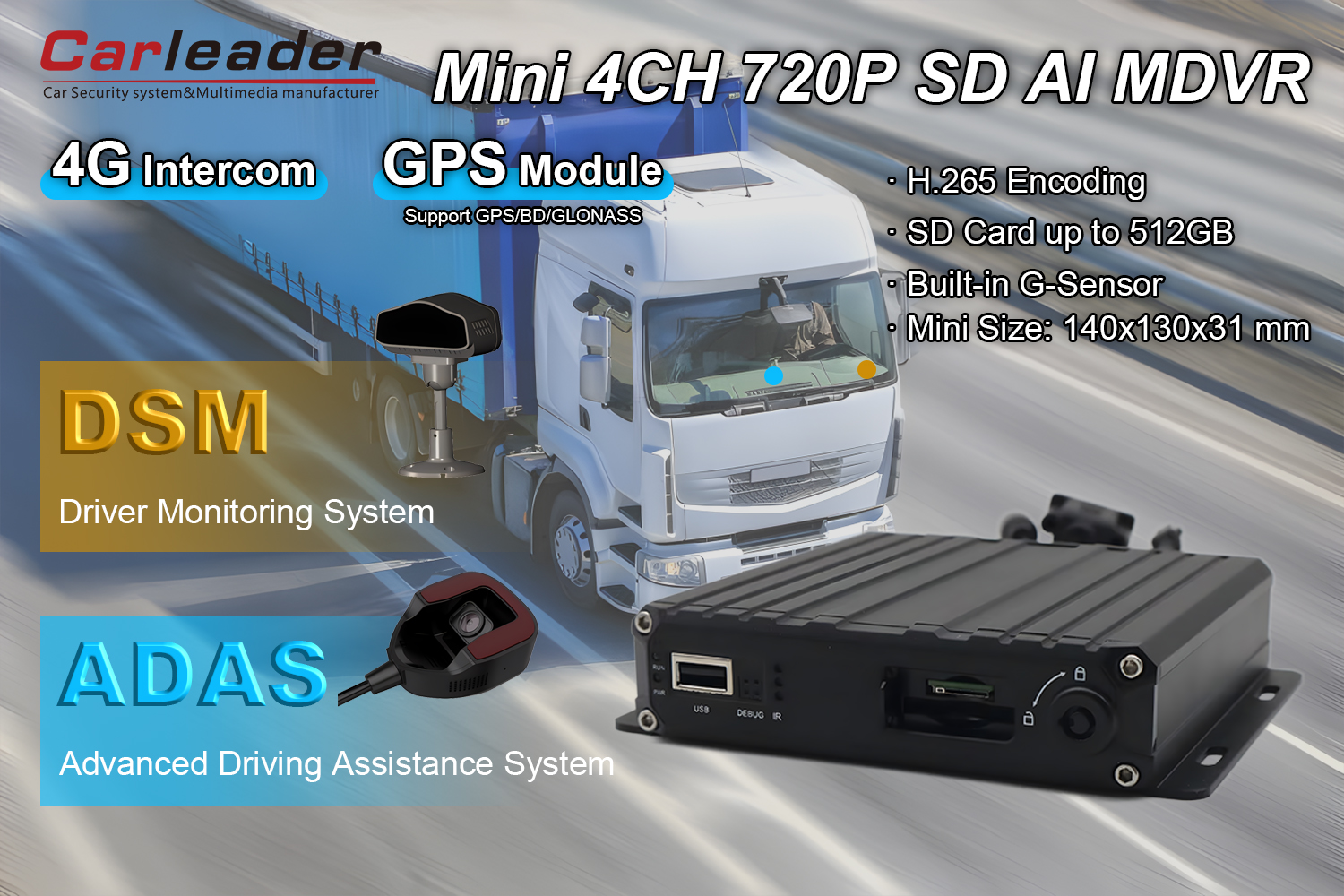 Карлидер4CH AI Intelligent Mobile DVR со DSM и ADAS камера претставува сеопфатно и интелигентно решение за надзор дизајнирано за потребите на современиот транспорт. Со интегрирање на критичните карактеристики како што се аналитика управувана од вештачка интелигенција, силна заштита на податоците, еластично управување со енергијата и глобално поврзување во компактен и издржлив дизајн, тој обезбедува неспоредлива сигурност и увид за менаџерите на возниот парк и за сопствениците на возила. Изберете Carleader MDVR за да ја подобрите безбедноста, да обезбедите усогласеност и да стекнете мир преку напредниот мобилен видео надзор.