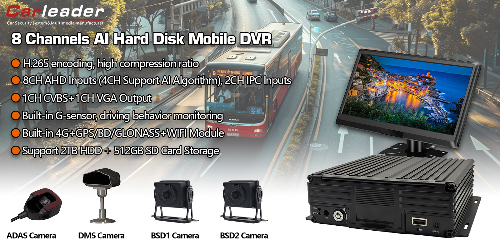 Карлидер8CH AI HDD за мобилни DVR Поддршка ADAS+DMS+BSDе совршено решение за комерцијални флоти, јавен превоз, логистика и специјални возила кои бараат: