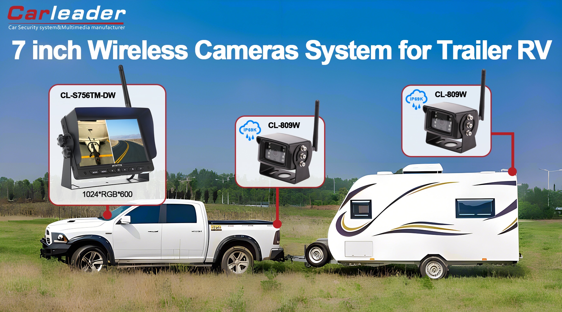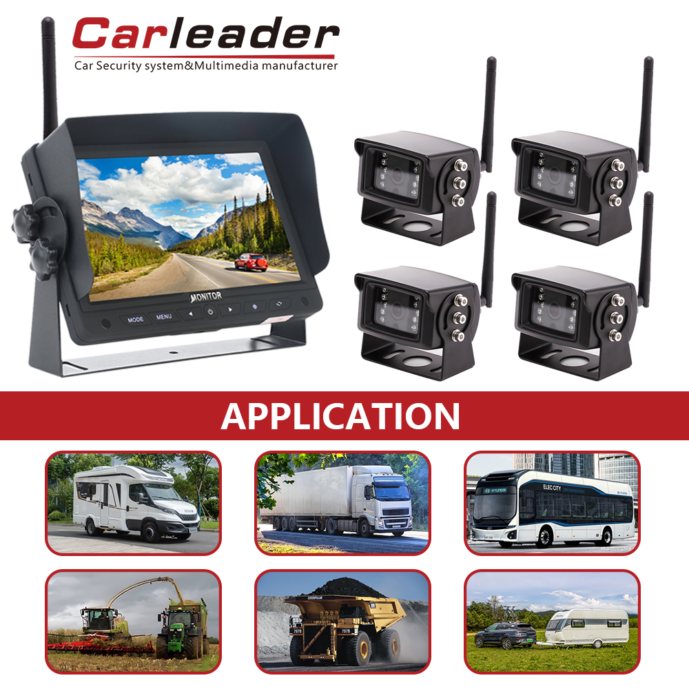 Разновидност: Carleader 7-инчен 2.4G дигитален безжичен 2CH дисплеј систем за камера може да се користи на различни возила, вклучувајќи RV, автобуси, камиони, приколки итн.