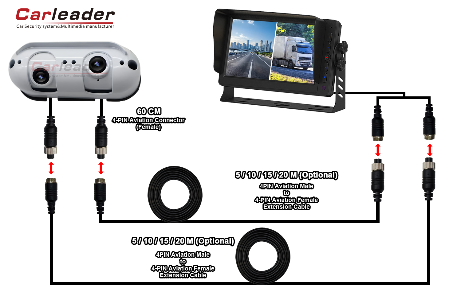 Второто решение ќе има два продолжни кабли, но дефиницијата на камерата е стандарден 4-PIN авијациски конектор, се додека вашиот продолжен кабел е стандарден 4-PIN авијациски конектор, тој ќе биде компатибилен за вашиот продолжен кабел.