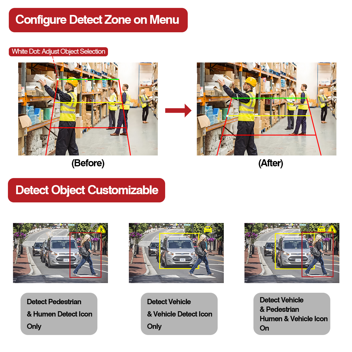 Оваа камера со вештачка интелигенција со вградена функција за предупредувачко светло, светлата боја ќе се промени во соодветната боја кога предметот за откривање ќе влезе во различна област за откривање (Црвена, Жолта, Зелена). Исто така, интегрирајте се со алармот за аларм околу пешаците и возилата кои се приближуваат до вашето возило.