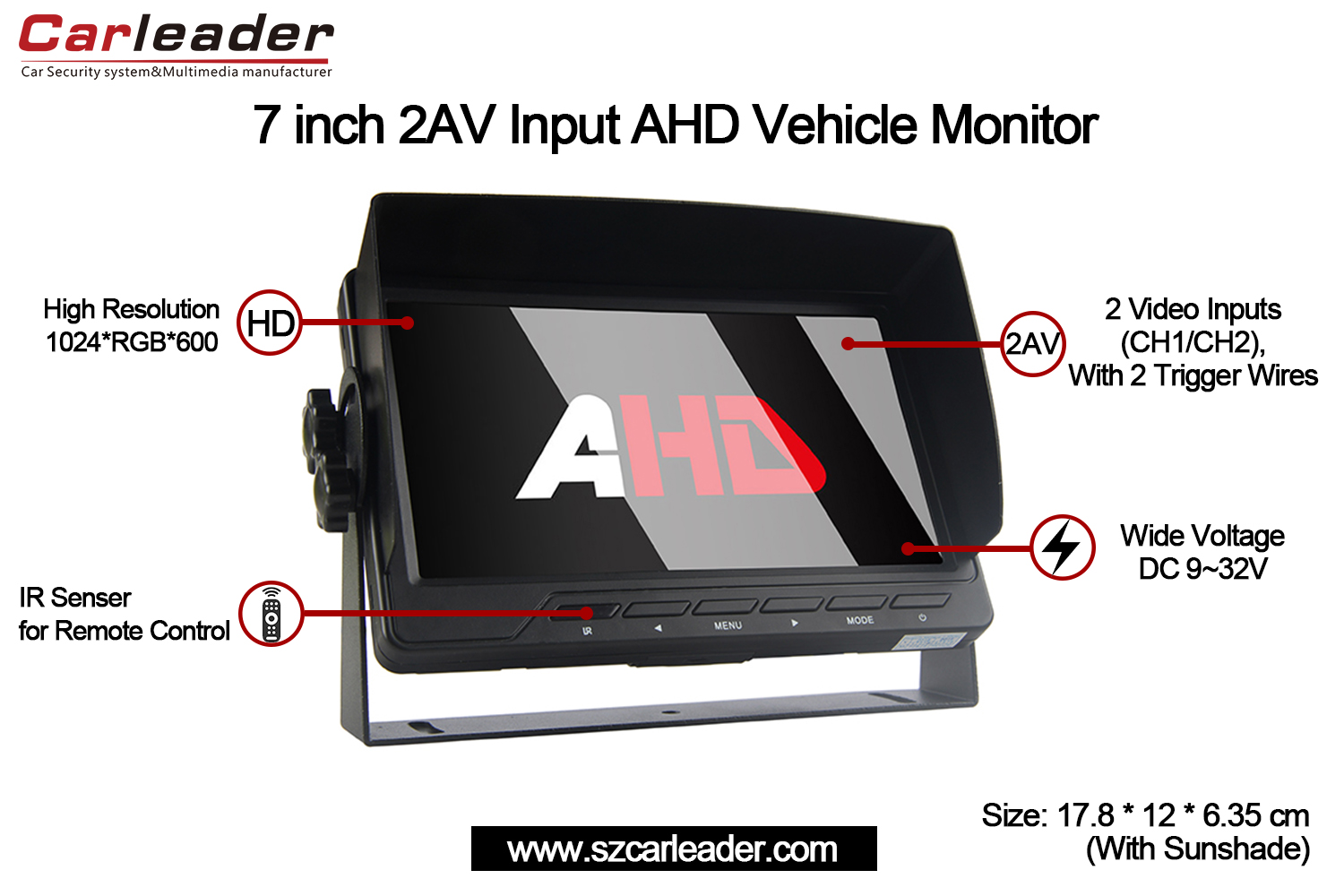 Карлидер7 инчен AHD 2CH влезен монитор на возилотокомбинира доверливост, јасност и разновидност во компактен и издржлив дизајн, што го прави одличен избор за професионални и лични потреби за следење на возилото.