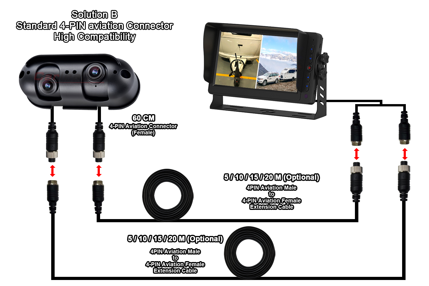 Второто решение ќе има два продолжни кабли, но дефиницијата на камерата е стандарден 4-PIN авијациски конектор, се додека вашиот продолжен кабел е стандарден 4-PIN авијациски конектор, тој ќе биде компатибилен за вашиот продолжен кабел.