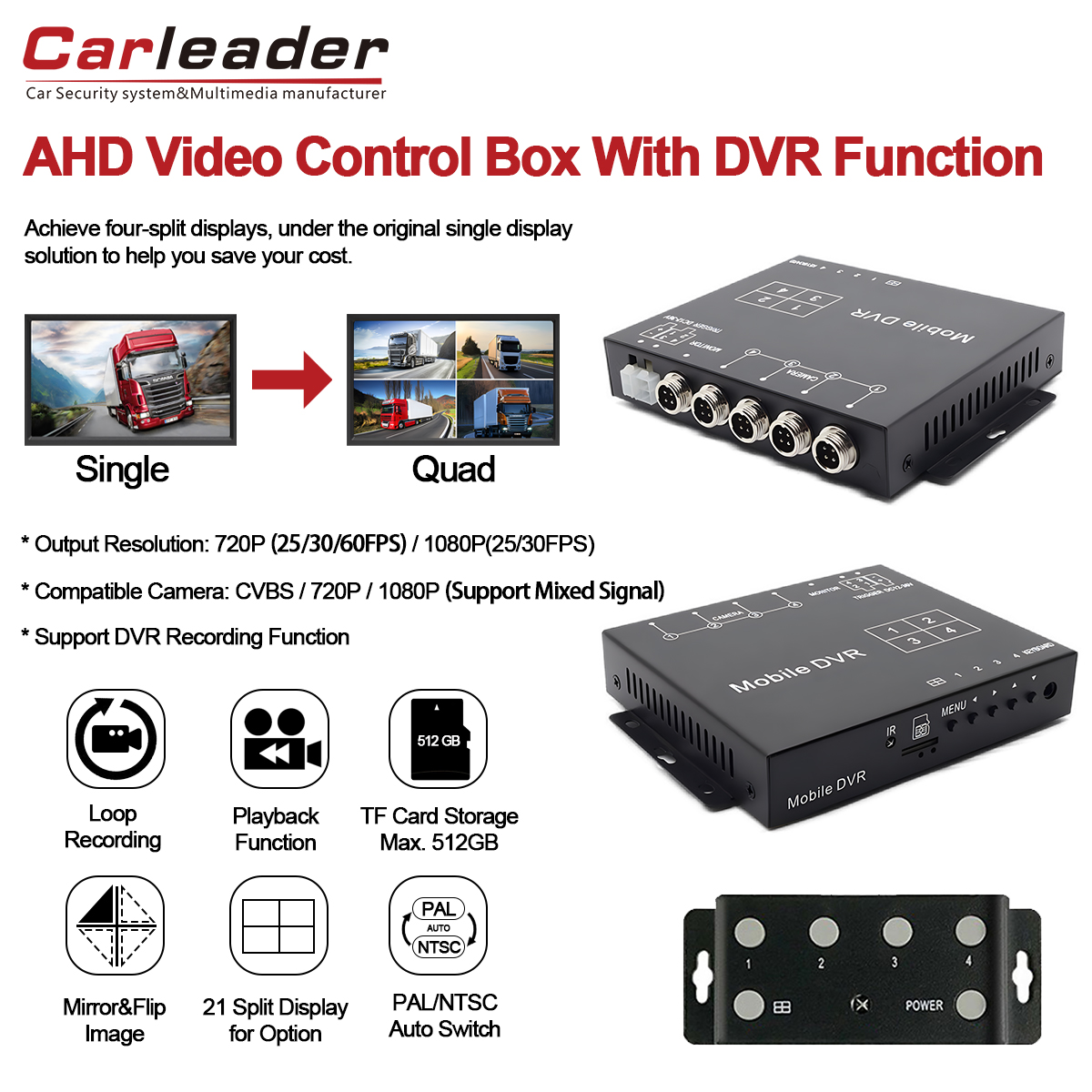 Carleader Quad Video Splitter Box ја комбинира удобноста на кутијата за видео сплитер со 4 CH и безбедноста на функцијата за снимање DVR. Неговиот сеопфатен сет на функции, вклучувајќи одделни поставки за слика, флексибилни режими на активирање (жица за активирање и далечински управувач), прилагодување на рабовите на екранот, широк влез на напон и силна заштита - обезбедува сигурно и висококвалитетно решение за надзор приспособено за бараната мобилна средина. Обезбедете целосна свесност за ситуацијата и безбеден видео доказ со Carleader 1080P AHD Quad Split Display Video Processor Поддршка за снимање видео.
